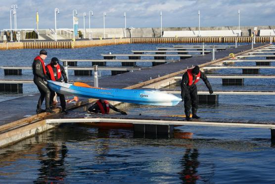 Powitanie Marka Kamińskiego wpływającego kajakiem do Bałtyku